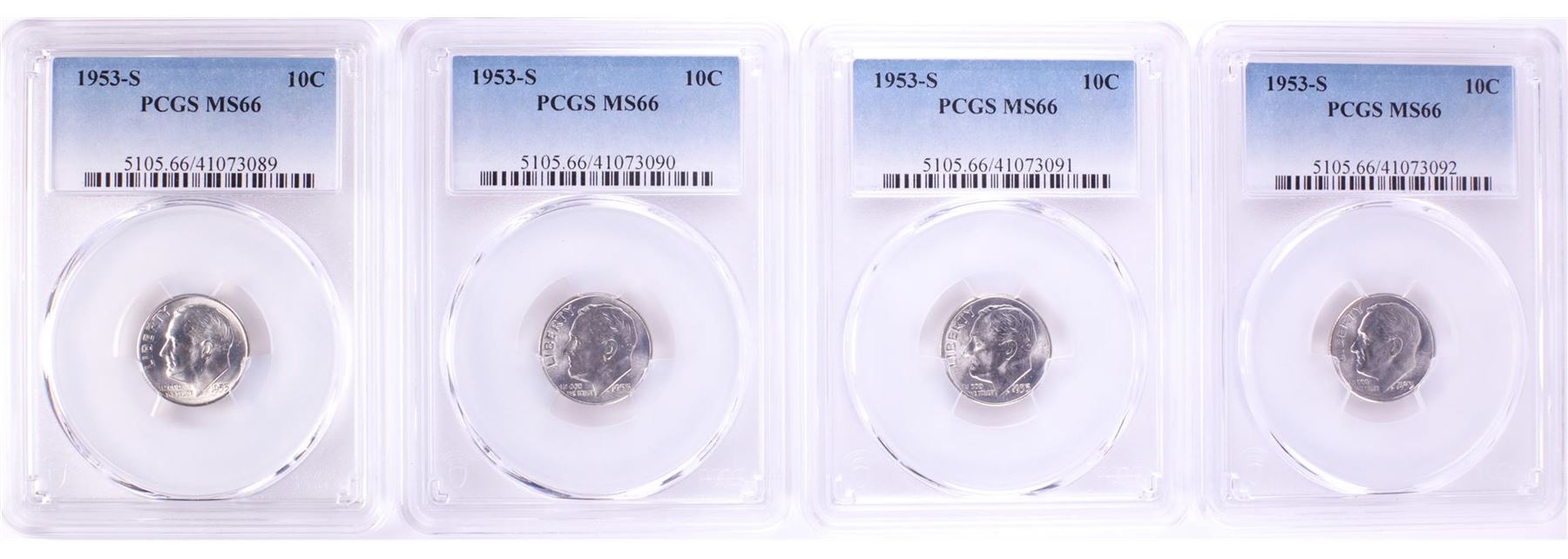 One Lot of (4) 1953-S Roosevelt Dime Coins PCGS MS66.