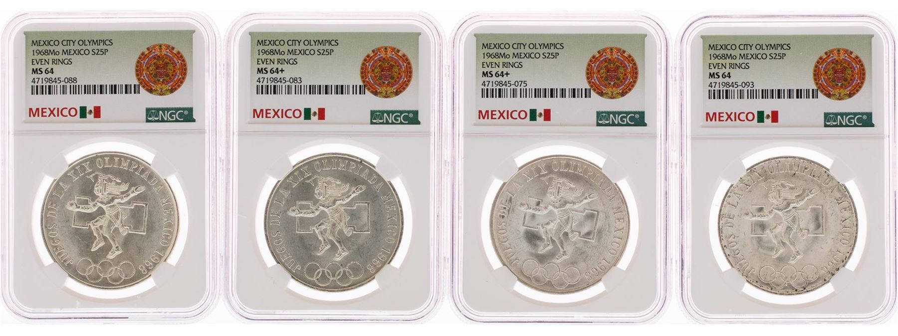 One Lot of (4) 1968Mo Mexico 25 Pesos Olympics Commemorative Silver Coins NGC MS64. NGC Certified.