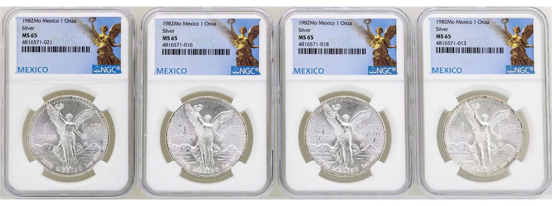 Lot of (4) 1982Mo Mexico Libertad Onza Silver Coins NGC MS65
