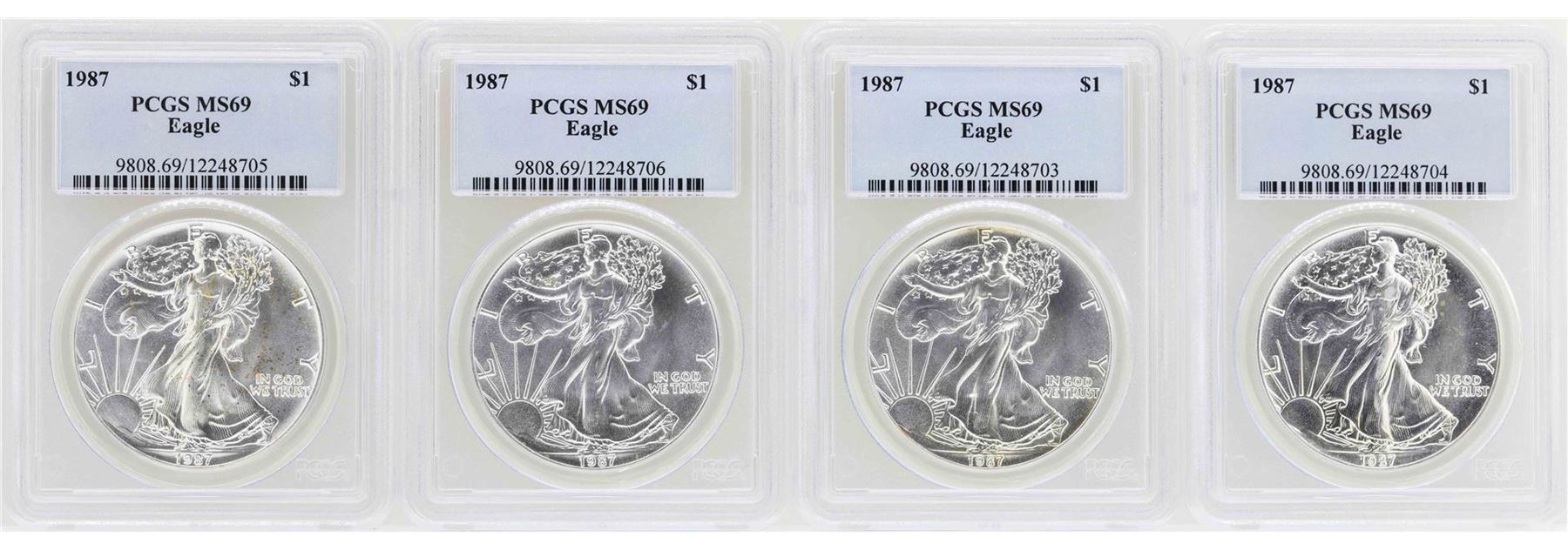 One Lot of (4) 1987 $1 American Silver Eagle Coins PCGS MS69. PCGS Graded.