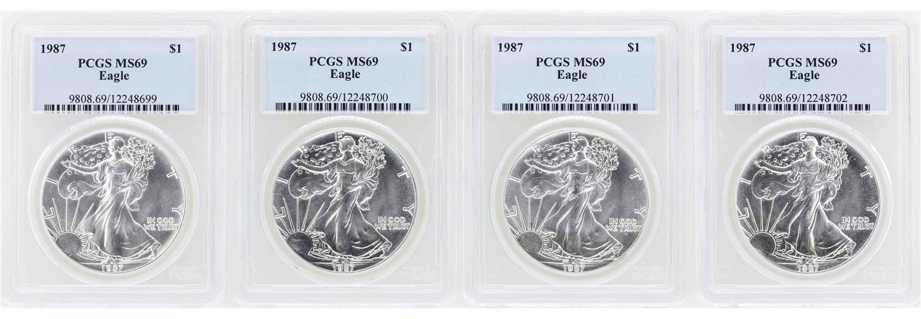 One Lot of (4) 1987 $1 American Silver Eagle Coins PCGS MS69. PCGS Graded.