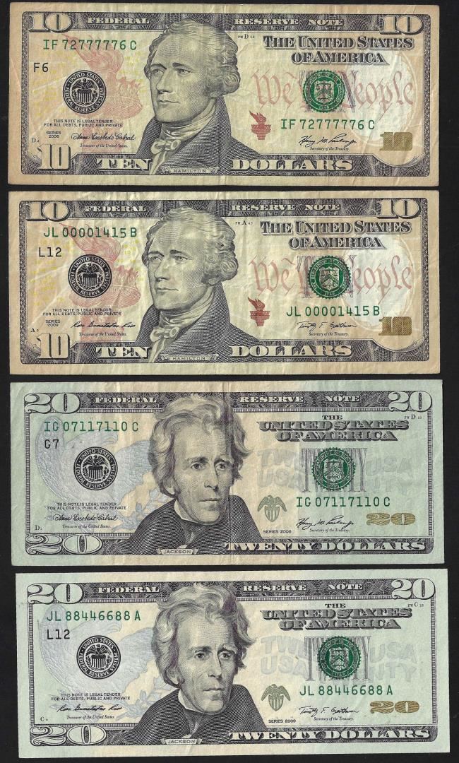 Lot of (4) 2006/2009 $10 & $20 Federal Reserve Note Fancy Trinary Serial Numbers