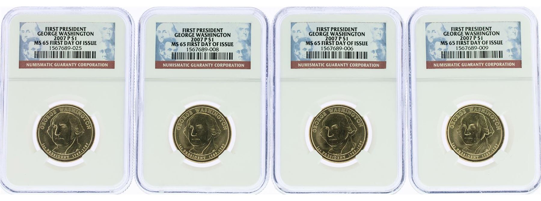 One Lot of (4) 2007-P George Washington Presidential Dollar Coins NGC MS65 FDOI. NGC Certified.