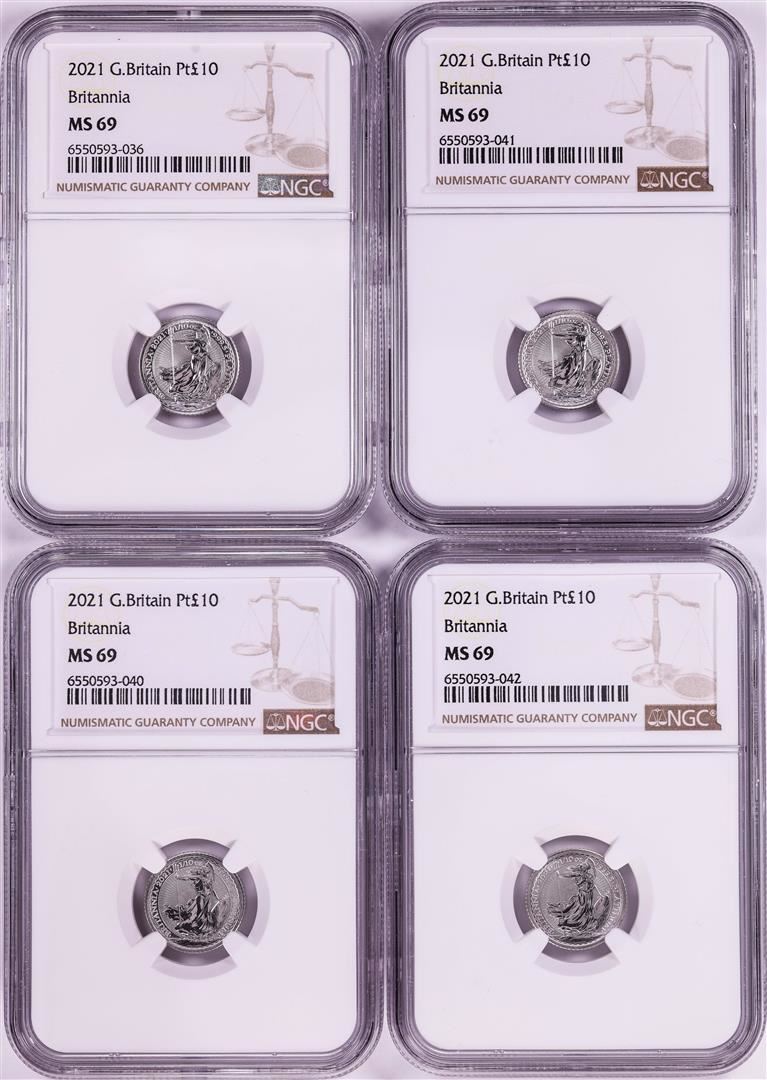 Lot of (4) 2021 Great Britain 10 Pounds Britannia 1/10oz Platinum Coins NGC MS69