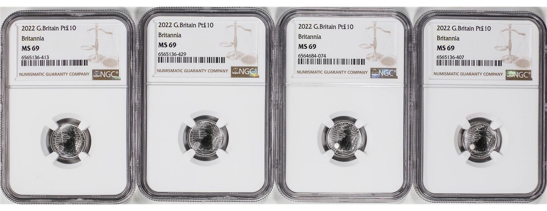 One Lot of (4) 2022 Great Britain 10 Pounds Britannia 1/10oz Platinum Coins NGC MS69. NGC Certified.
