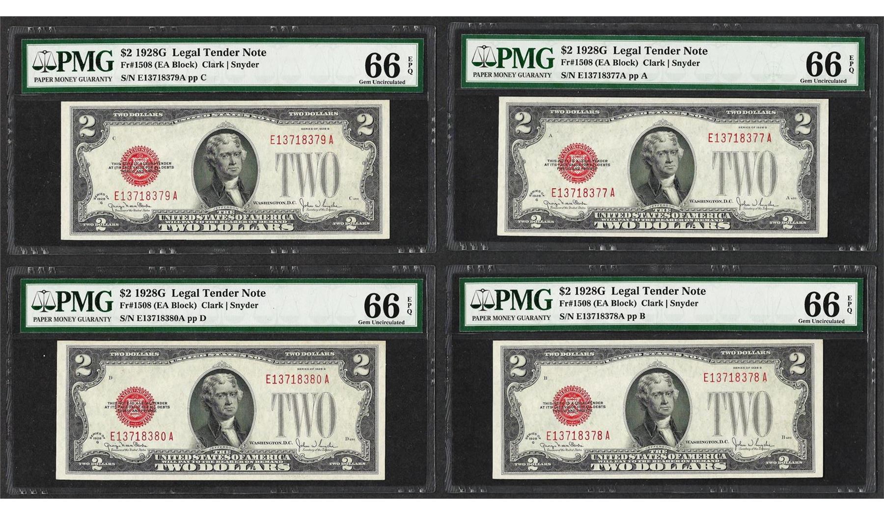 One Lot of (4) Consecutive 1928G $2 Legal Tender Notes Fr.1508 PMG Gem Uncirculated 66EPQ. PMG Certified.