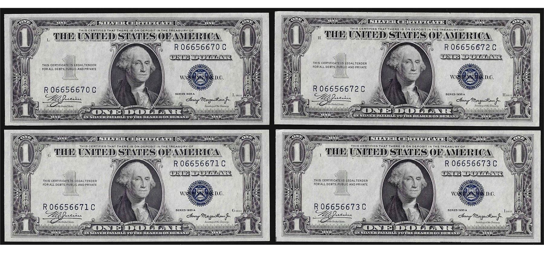 One Lot of (4) Consecutive 1935A $1 Silver Certificate Notes Uncirculated.