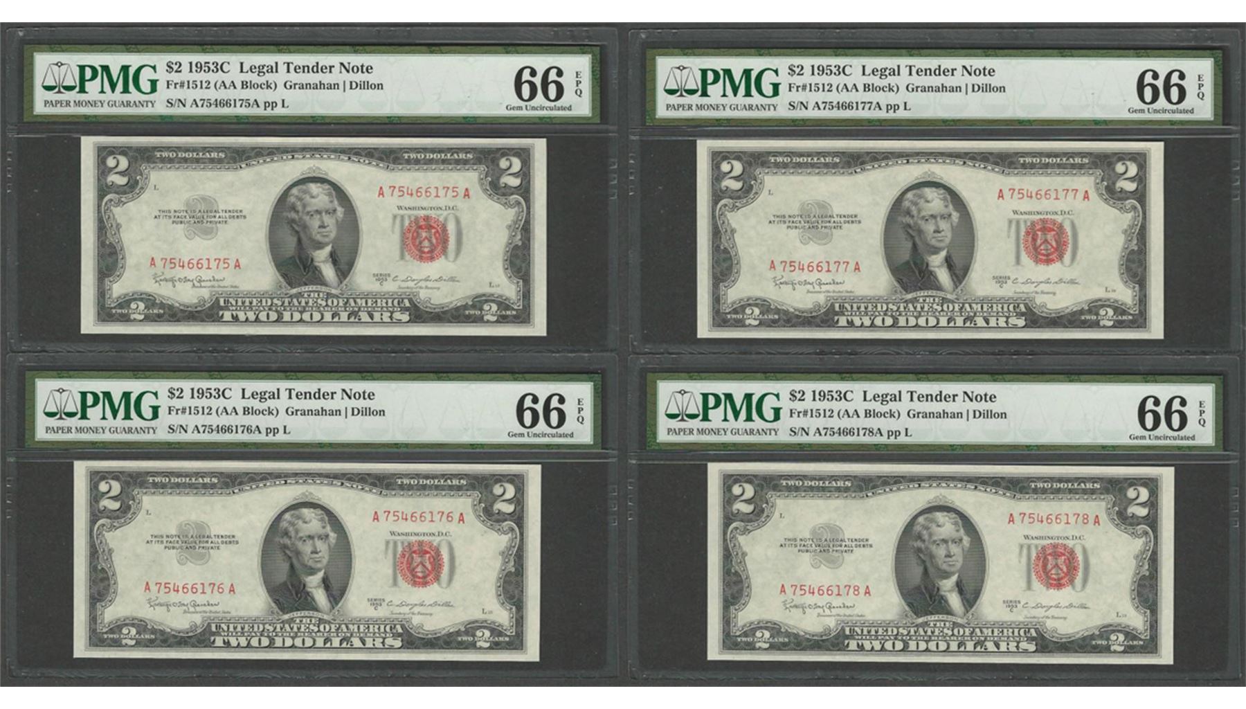 One Lot of (4) Consecutive 1953C $2 Legal Tender Notes Fr.1512 PMG Gem Uncirculated 66EPQ. PMG Certified.