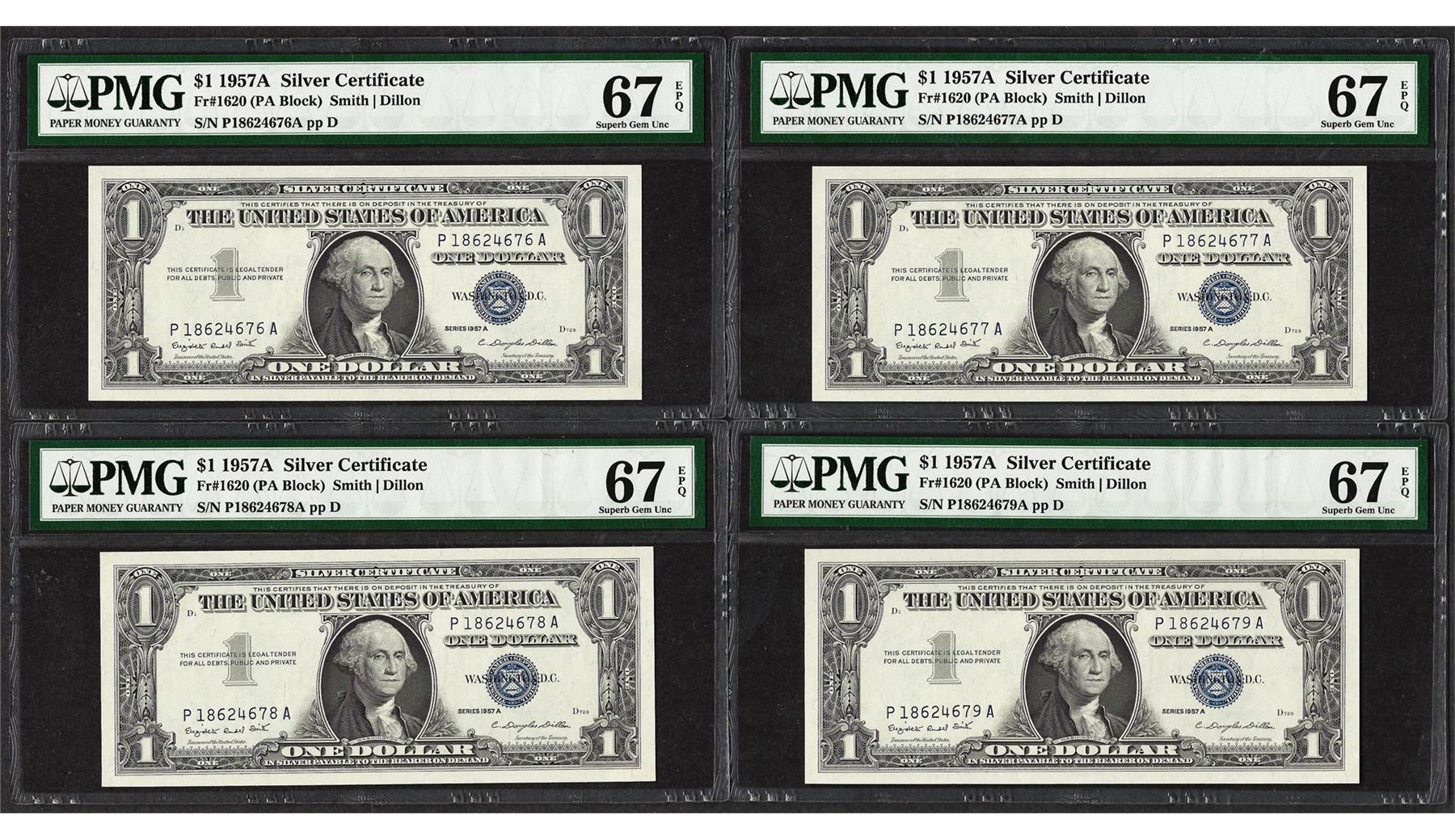 One Lot of (4) Consecutive 1957A $1 Silver Certificate Notes PMG Superb Gem Unc. 67EPQ. PMG Certified.
