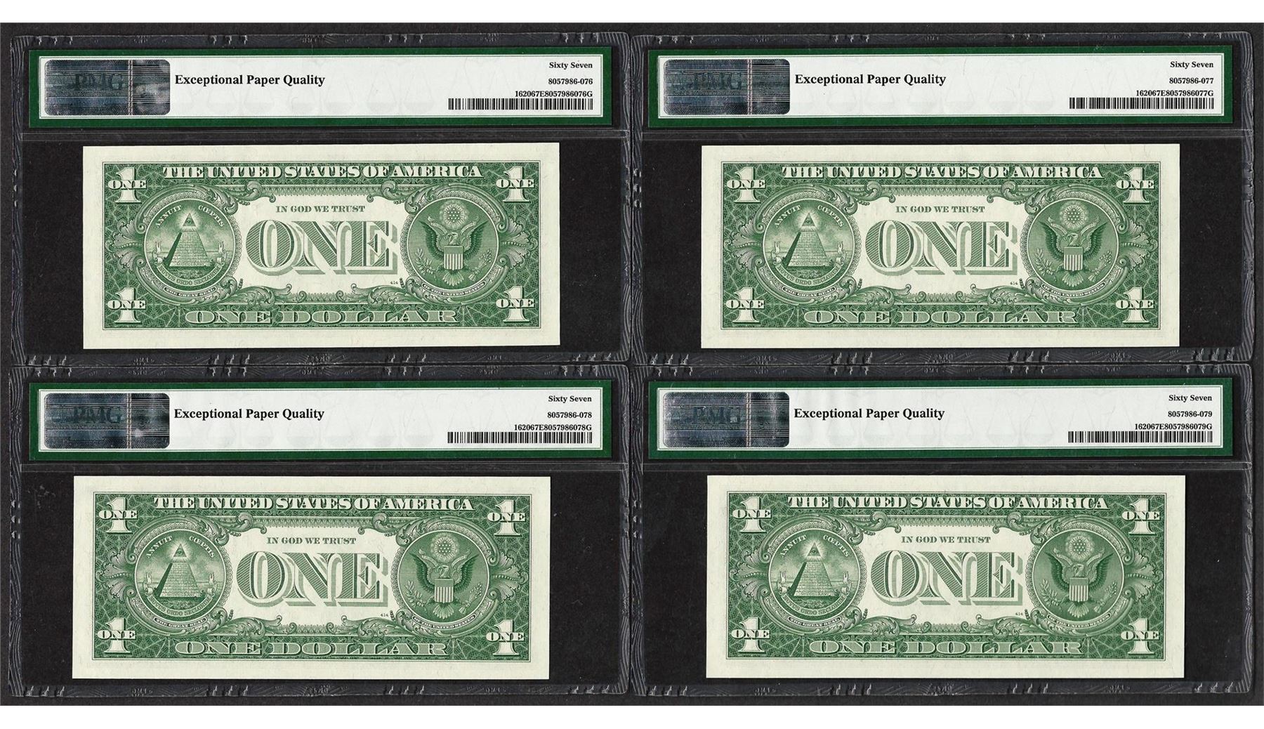 One Lot of (4) Consecutive 1957A $1 Silver Certificate Notes PMG Superb Gem Unc. 67EPQ. PMG Certified.