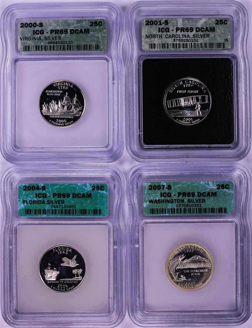 Lot of (4) Proof Silver State Quarter Coins ICG PR69DCAM