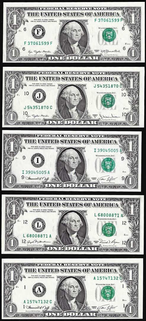 One Lot of (5) $1 Federal Reserve Notes Minor Shift Errors.
