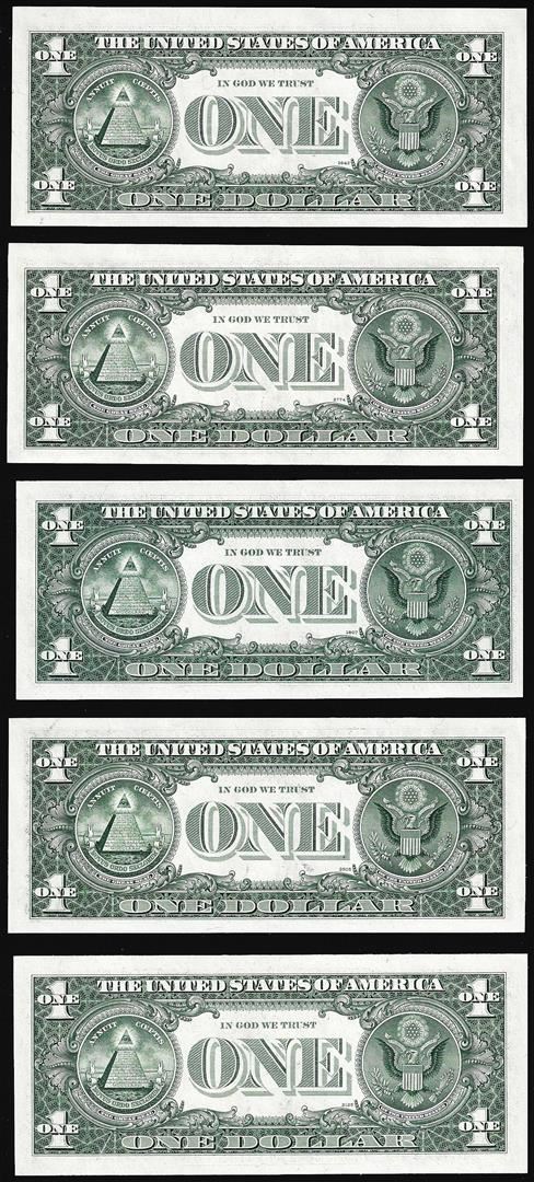 One Lot of (5) $1 Federal Reserve Notes Minor Shift Errors.