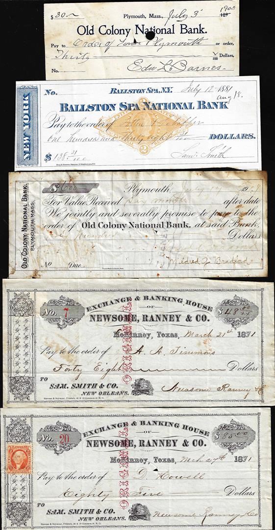 One Lot of (5) 1800's Miscellaneous Obsolete Checks.