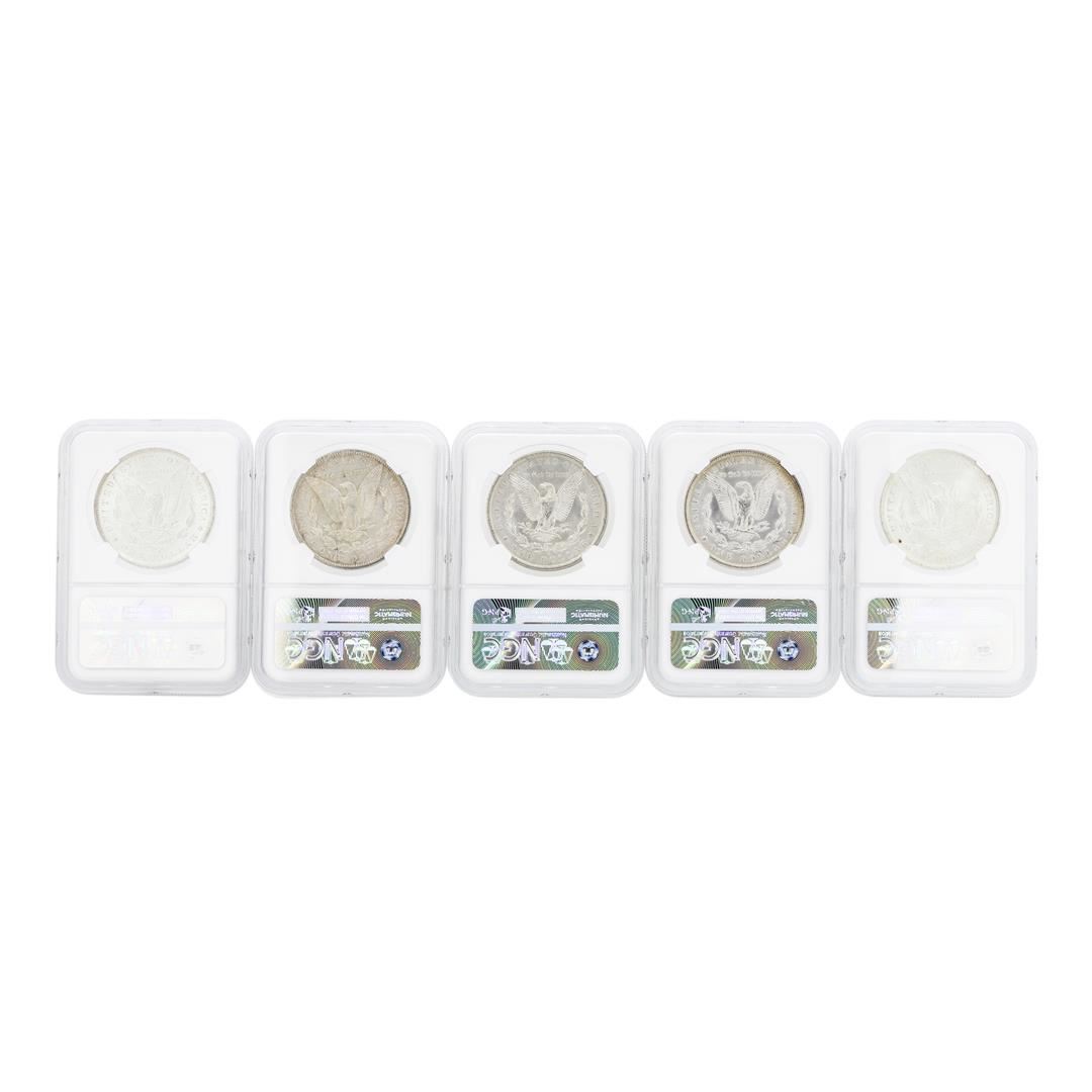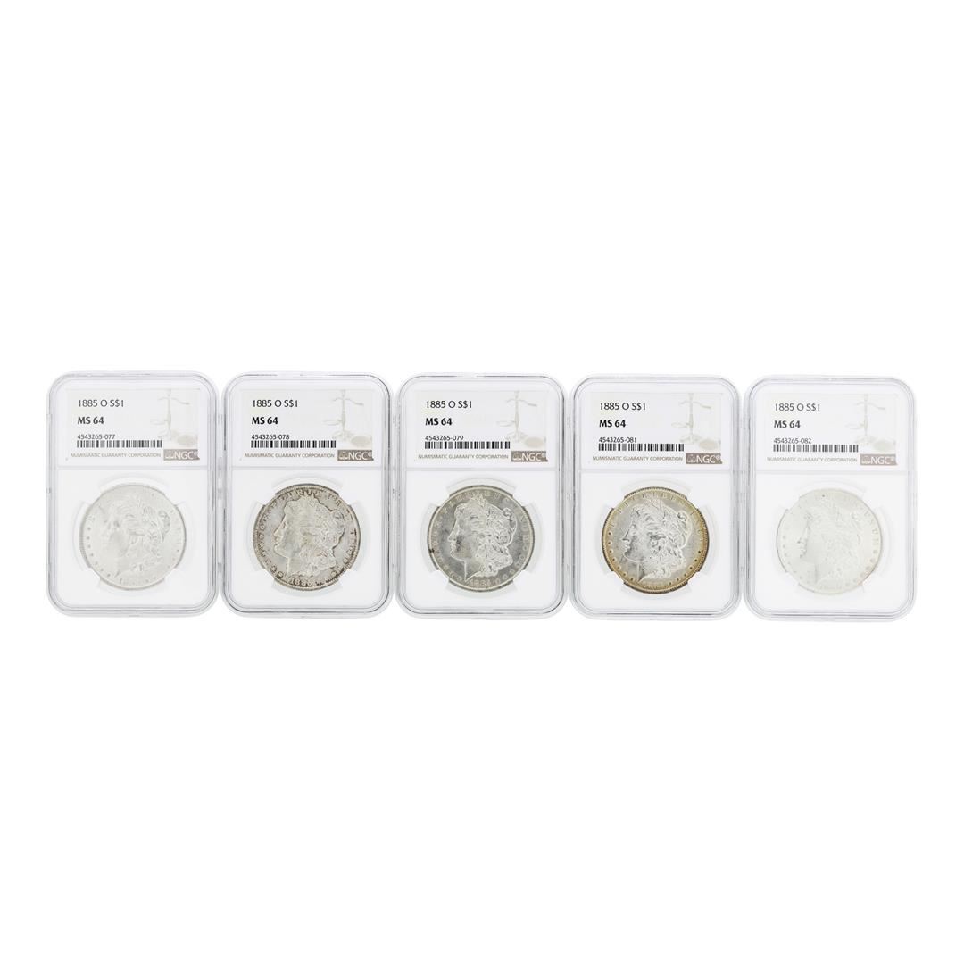 One Lot of (5) 1885-O $1 Morgan Silver Dollar Coins NGC MS64. NGC Certified.