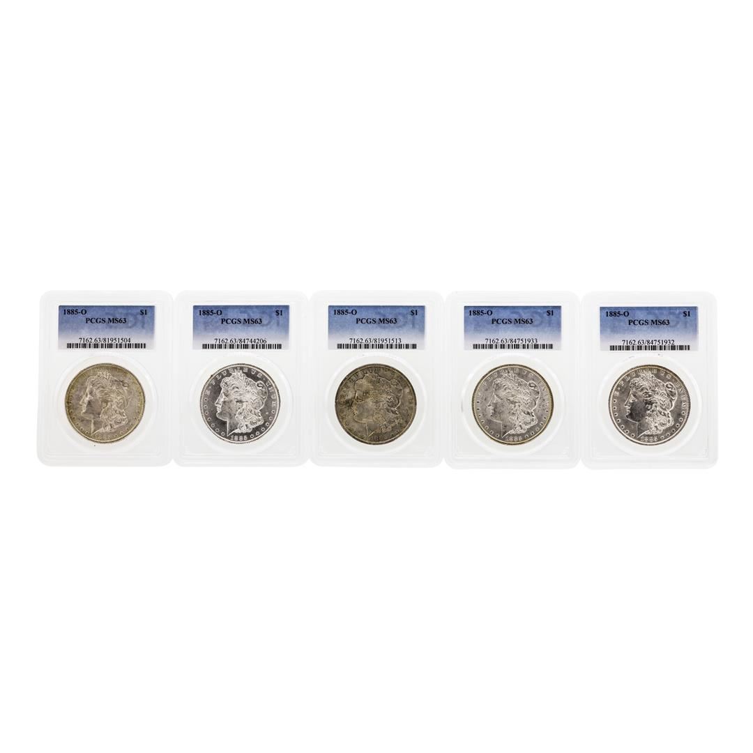 One Lot of (5) 1885-O $1 Morgan Silver Dollar Coins PCGS MS63. PCGS Graded.