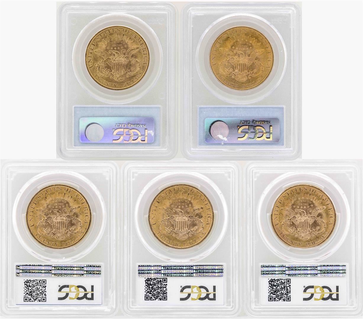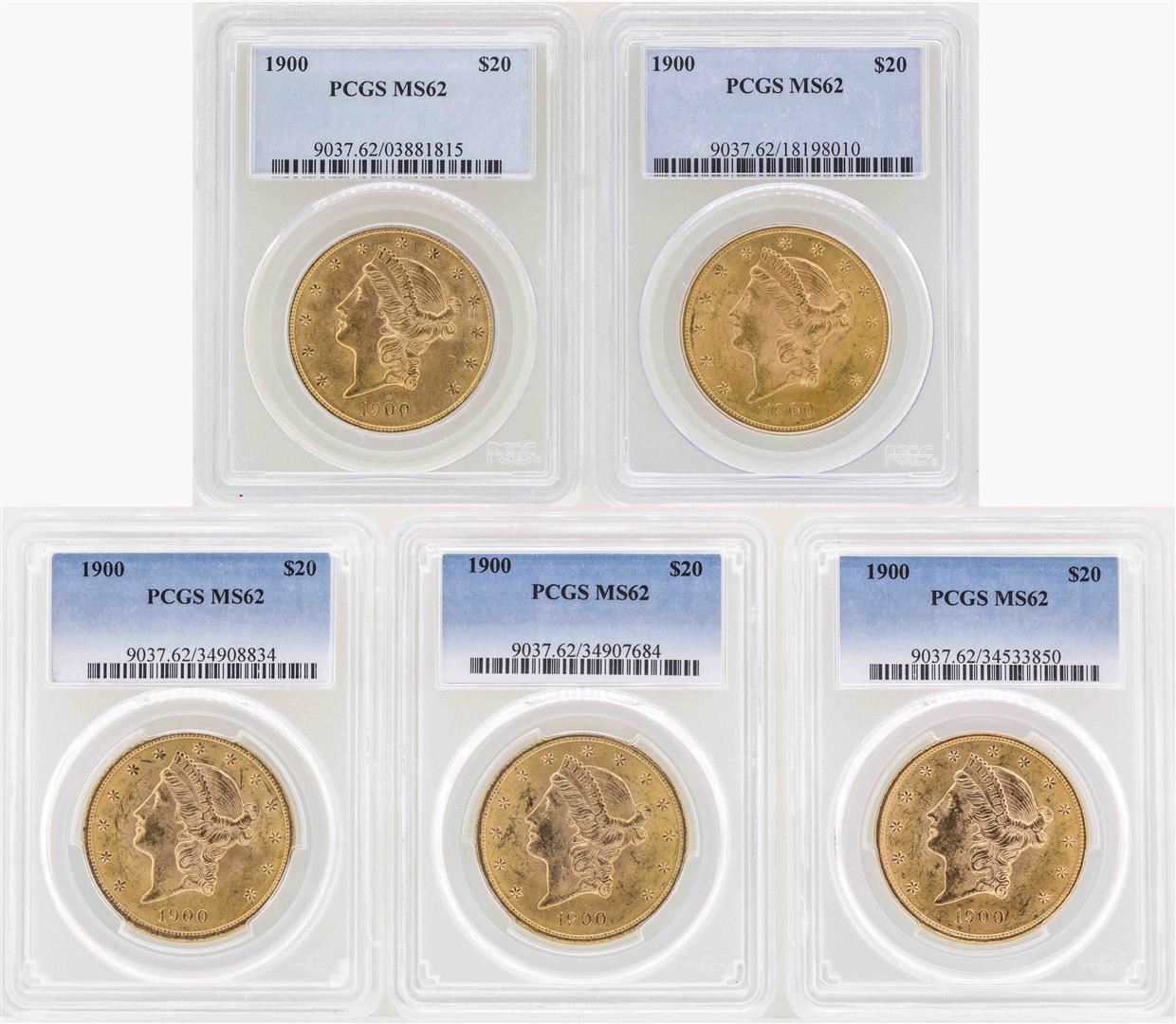 One Lot of (5) 1900 $20 Liberty Head Double Eagle Gold Coins PCGS MS62. PCGS Graded.
