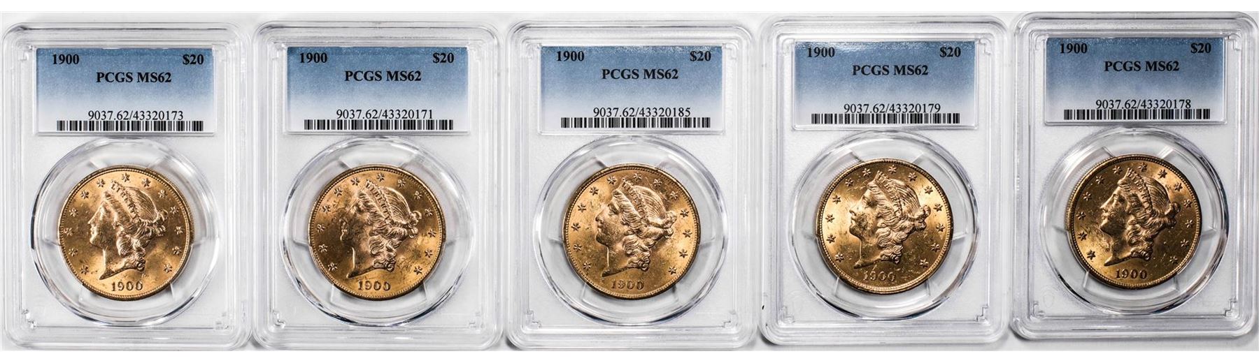 One Lot of (5) 1900 $20 Liberty Head Gold Coin PCGS MS62.