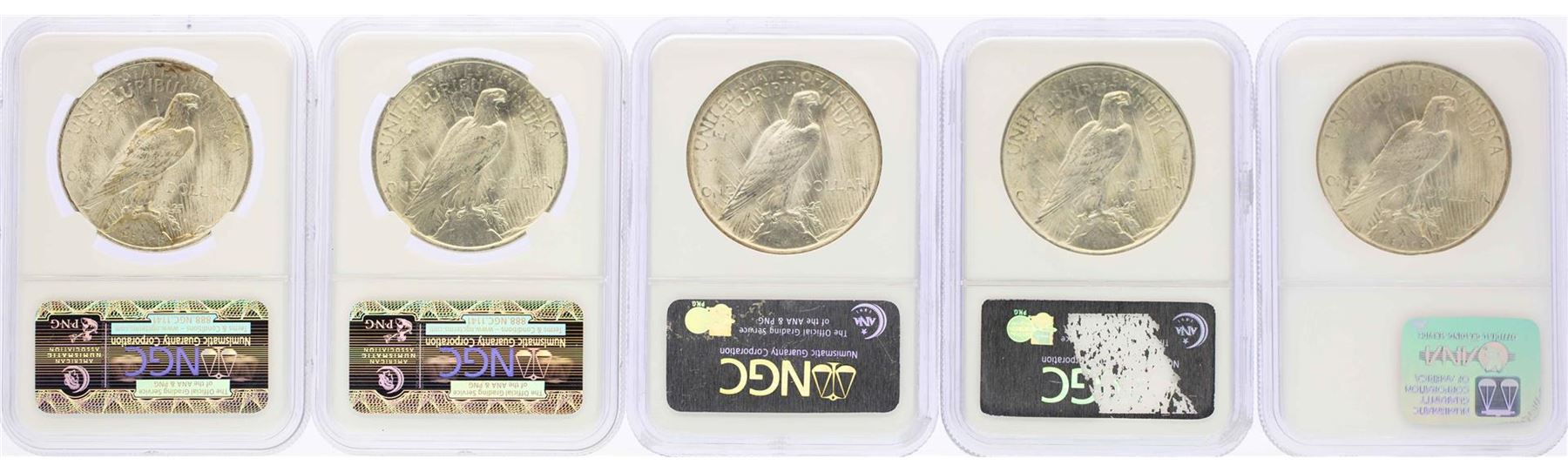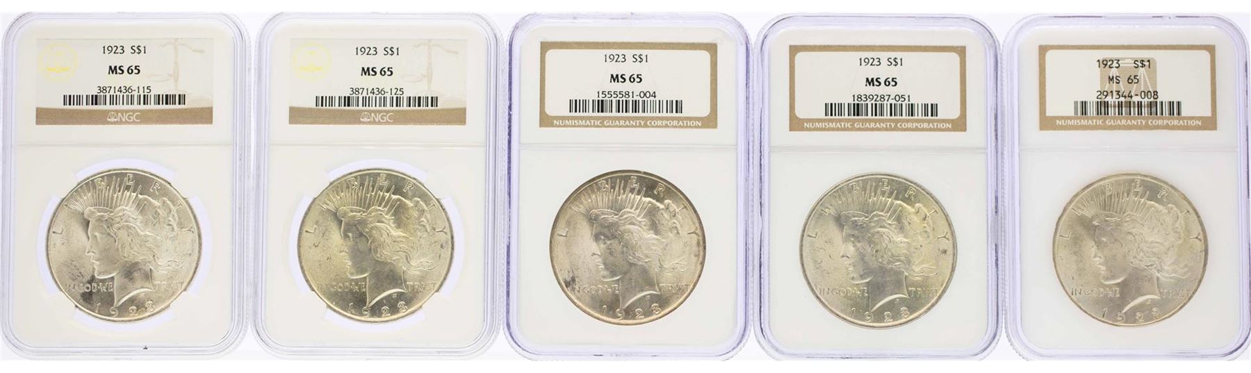 One Lot of (5) 1923 $1 Peace Silver Dollar Coins NGC MS65. NGC Certified.