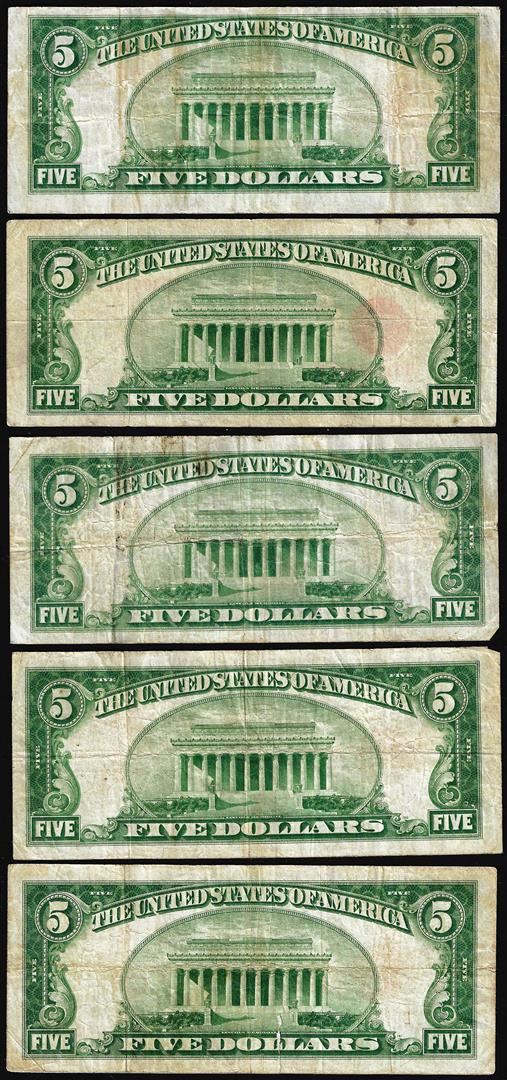 One Lot of (5) 1928 $5 Legal Tender Notes.