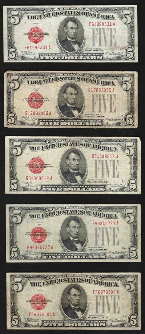 One Lot of (5) 1928C $5 Legal Tender Notes.