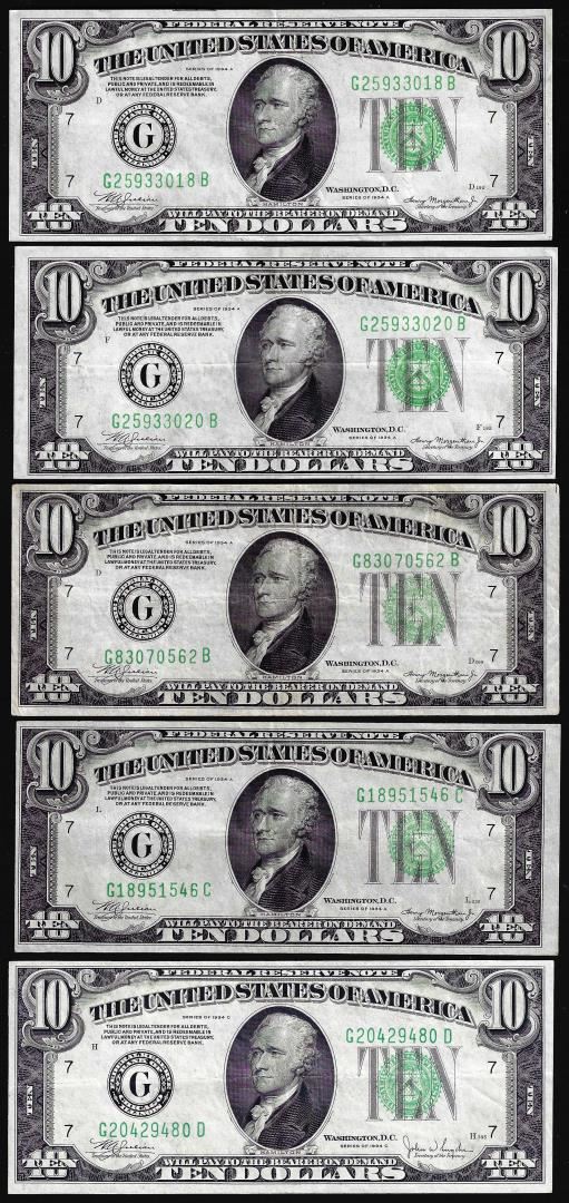 One Lot of (5) 1934 $10 Federal Reserve Notes.