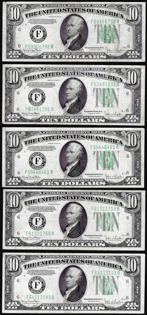 One Lot of (5) 1934D $10 Federal Reserve Notes Atlanta.