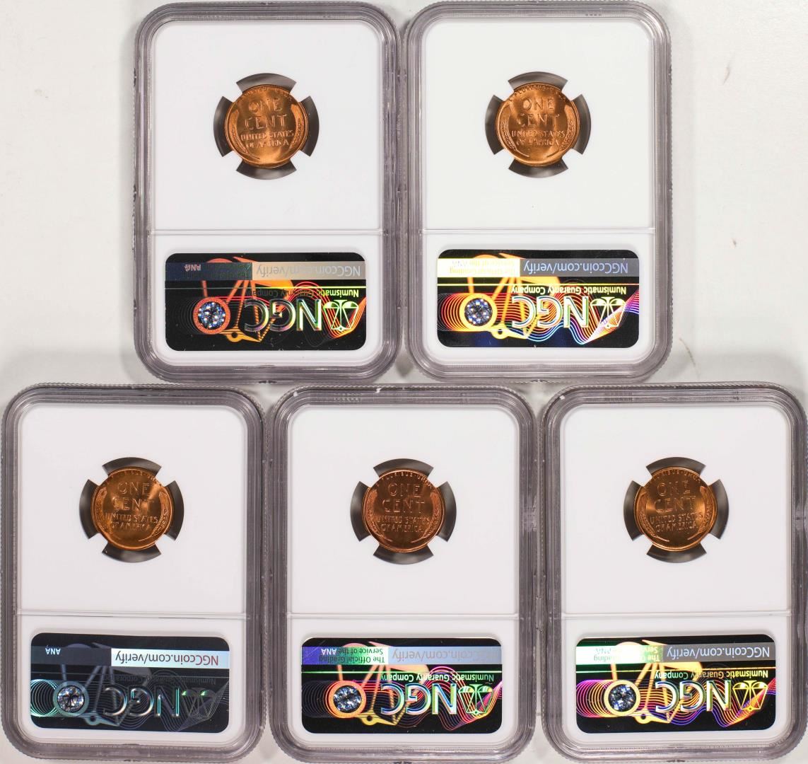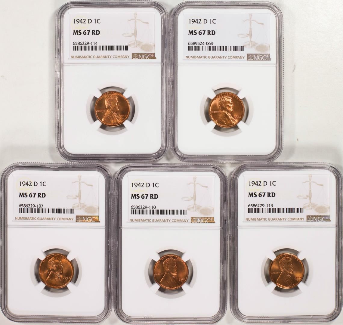 One Lot of (5) 1942-D Lincoln Wheat Cent Coins NGC MS67RD. NGC Certified.