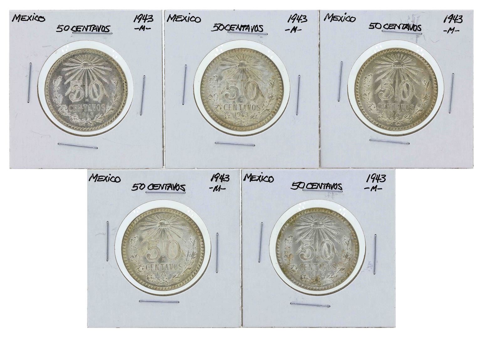 One Lot of (5) 1943M Mexico 50 Centavos Coins.
