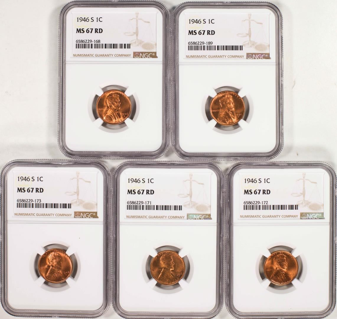 One Lot of (5) 1946-S Lincoln Wheat Cent Coins NGC MS67RD. NGC Certified.