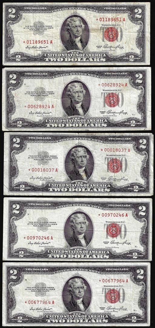 One Lot of (5) 1953 $2 Legal Tender Star Notes.