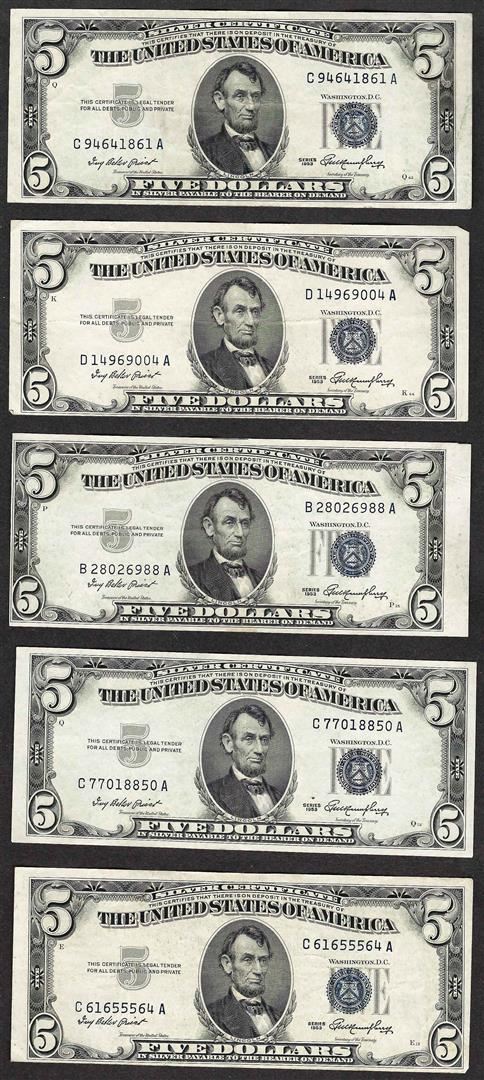 One Lot of (5) 1953 $5 Silver Certificate Notes.