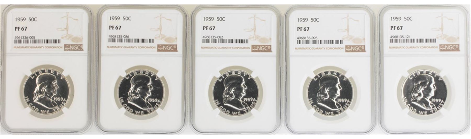 One Lot of (5) 1959 Proof Franklin Half Dollar Coins NGC PF67. NGC Certified.