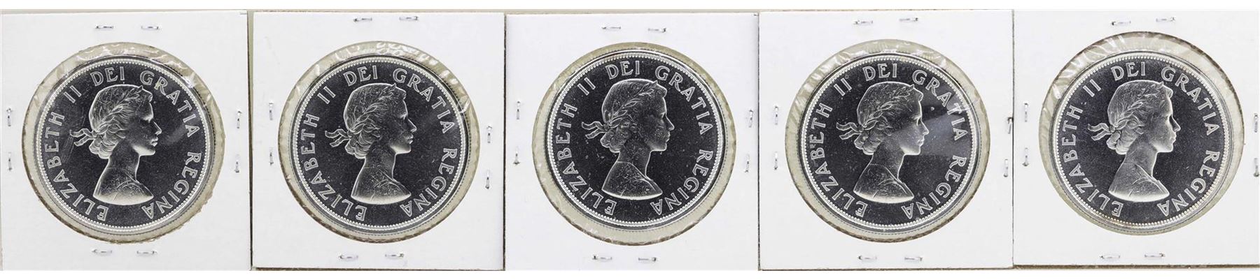 One Lot of (5) 1964 $1 Canada Silver Dollar Coins.