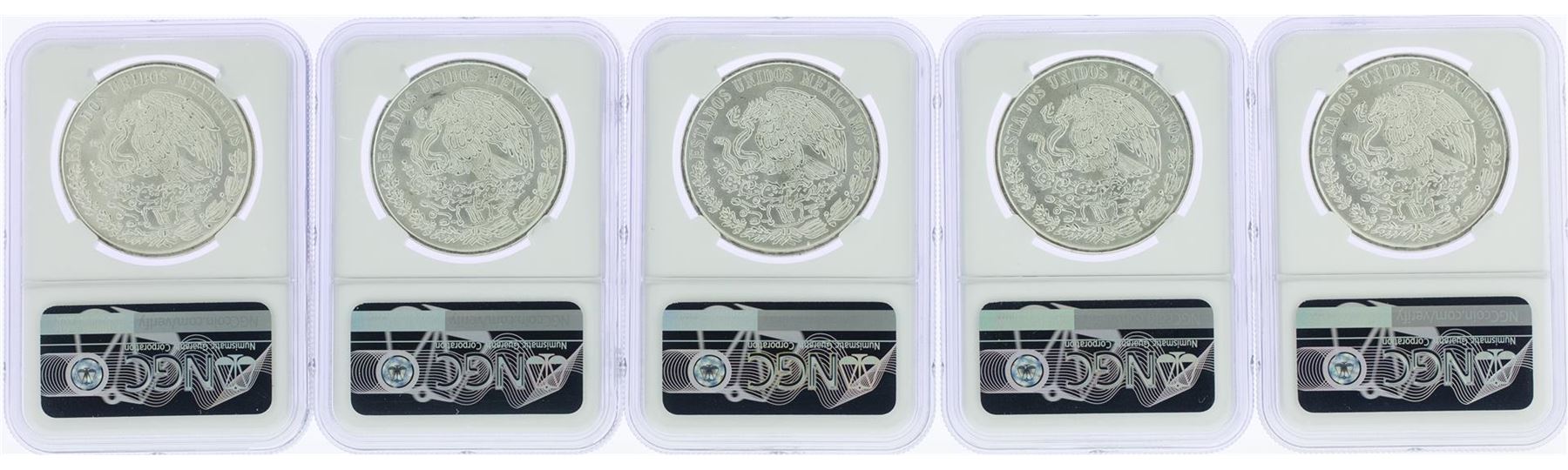Lot of (5) 1977Mo Mexico 100 Pesos Silver Coins NGC MS66 Level Date