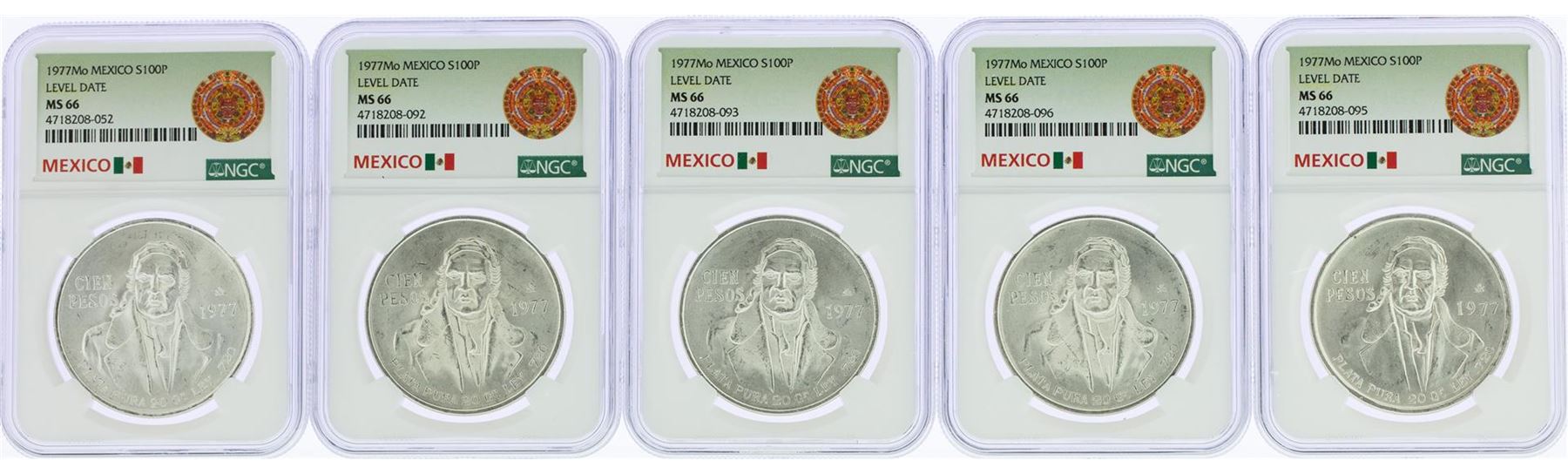 Lot of (5) 1977Mo Mexico 100 Pesos Silver Coins NGC MS66 Level Date