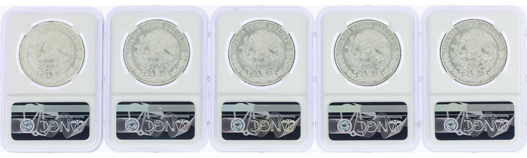 Lot of (5) 1977Mo Mexico 100 Pesos Silver Coins NGC MS66 Level Date