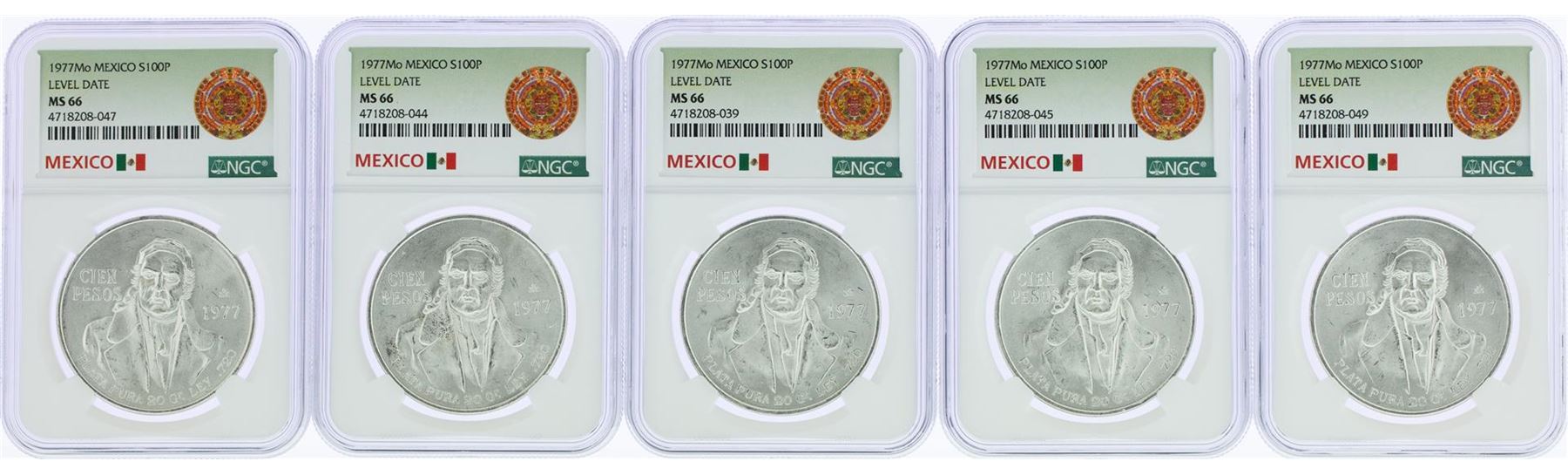 Lot of (5) 1977Mo Mexico 100 Pesos Silver Coins NGC MS66 Level Date