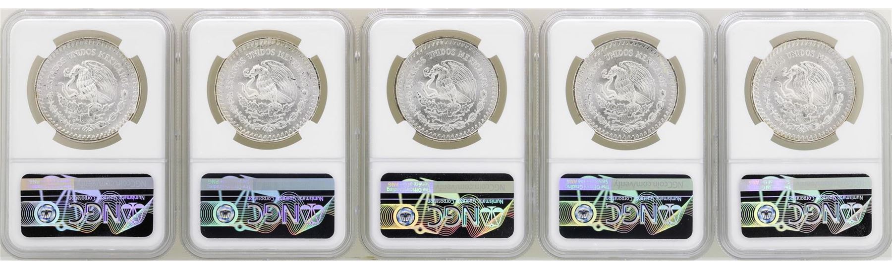 One Lot of (5) 1982Mo Mexico Libertad Onza Silver Coins NGC MS65. NGC Certified.