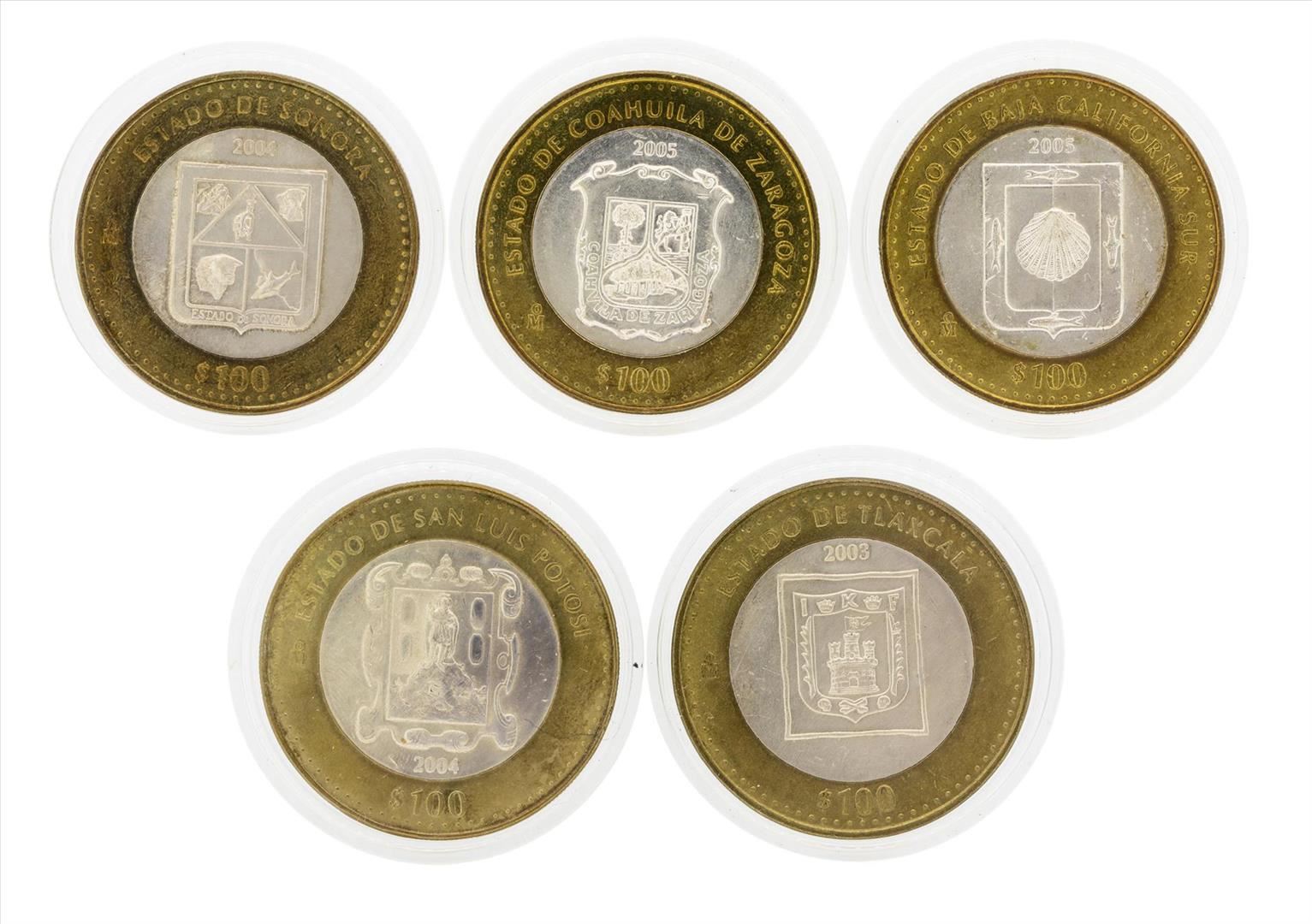 One Lot of (5) 2003-2005 Mexico 100 Pesos Bi-Metallic Coins.