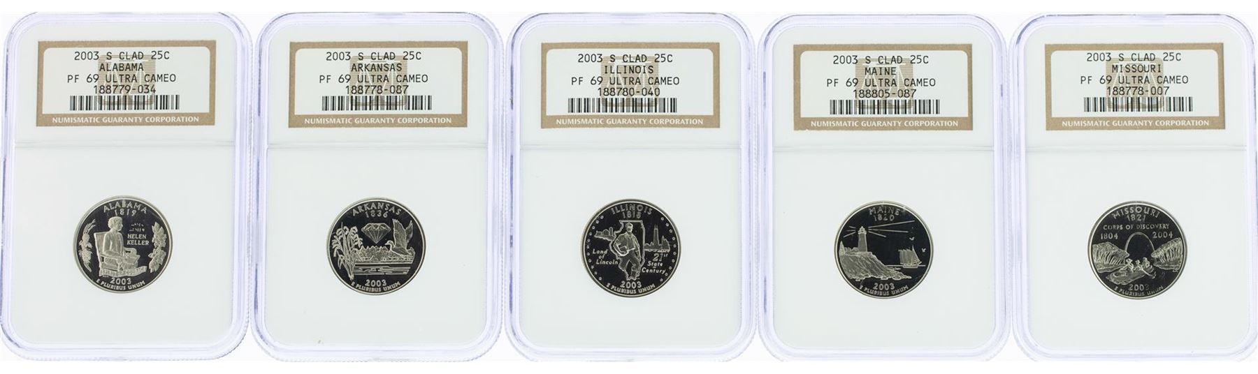 One Lot of (5) 2003-S State Quarter Clad Coins NGC PF69 Ultra Cameo. NGC Certified.