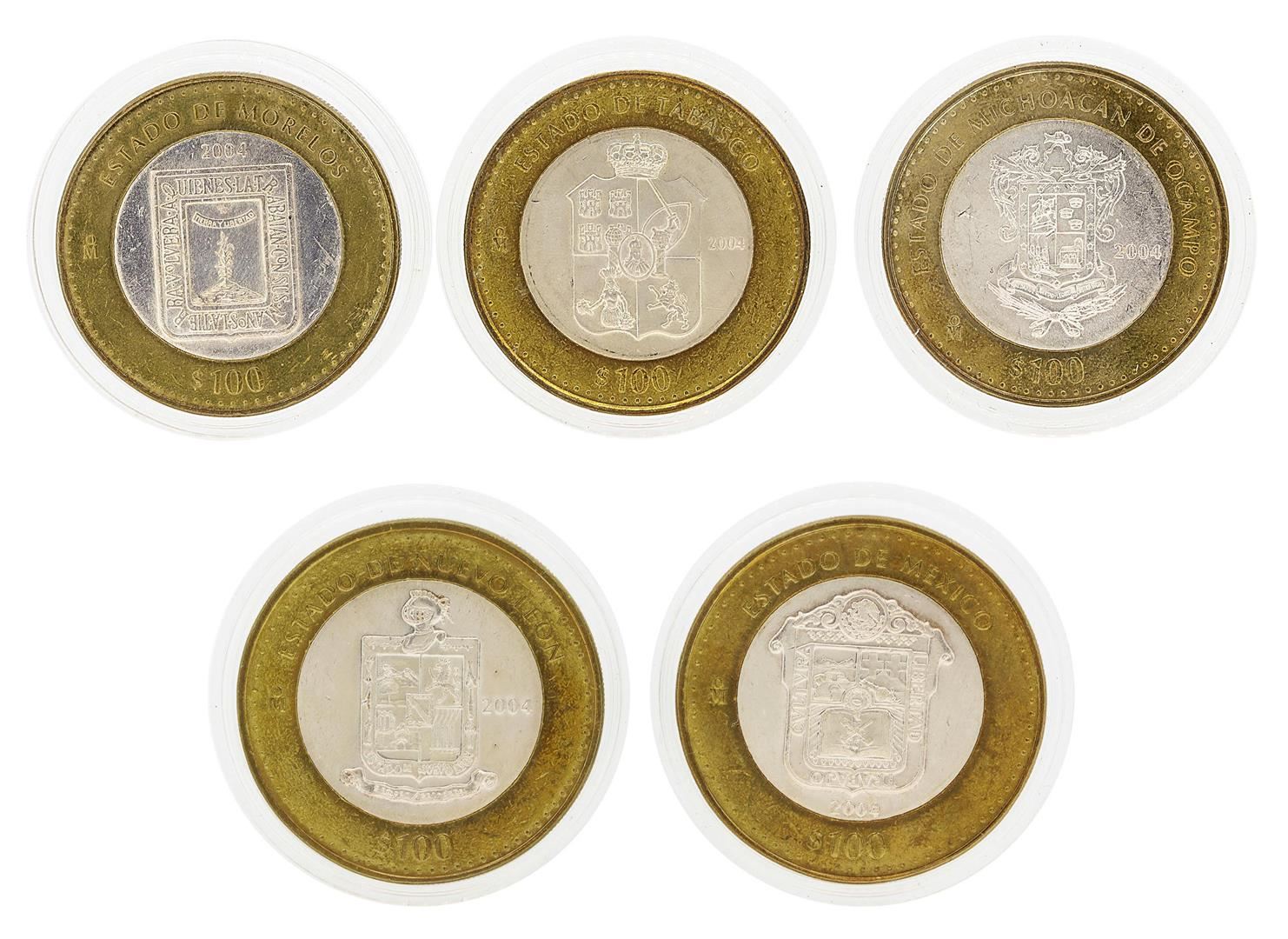One Lot of (5) 2004 Mexico 100 Pesos Bi-Metallic Coins.