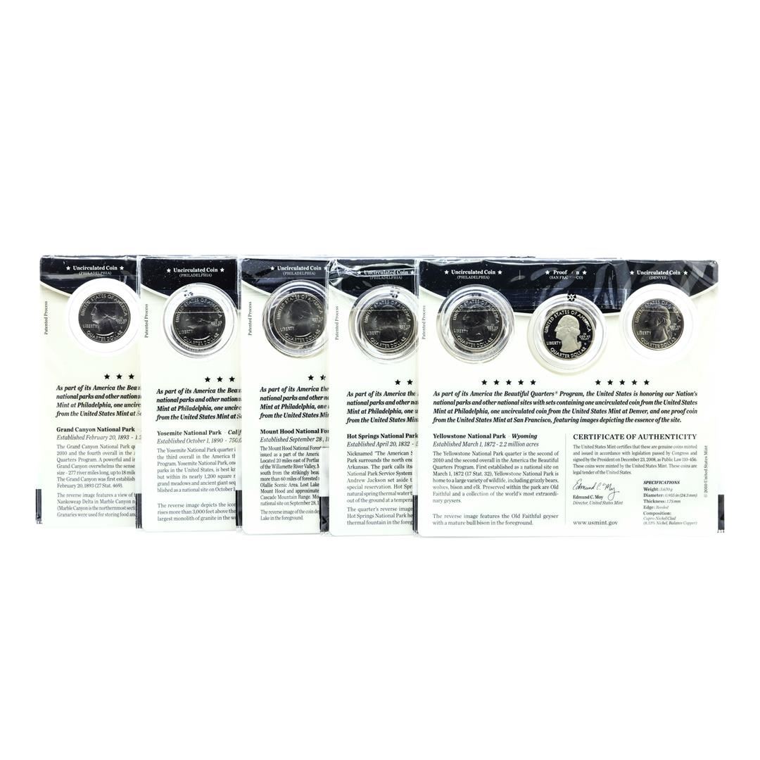 Lot of (5) 2010 America The Beautiful Three-Coin Quarter Sets, including (1) three coin set from each of the following:.