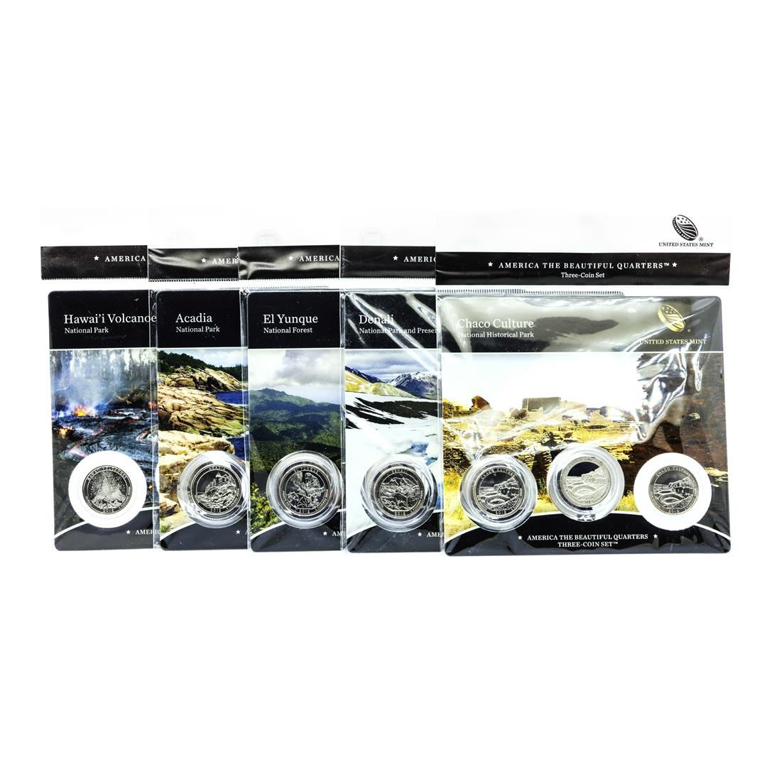 Lot of (5) 2012 America The Beautiful Three-Coin Quarter Sets, including (1) three coin set from each of the following:.