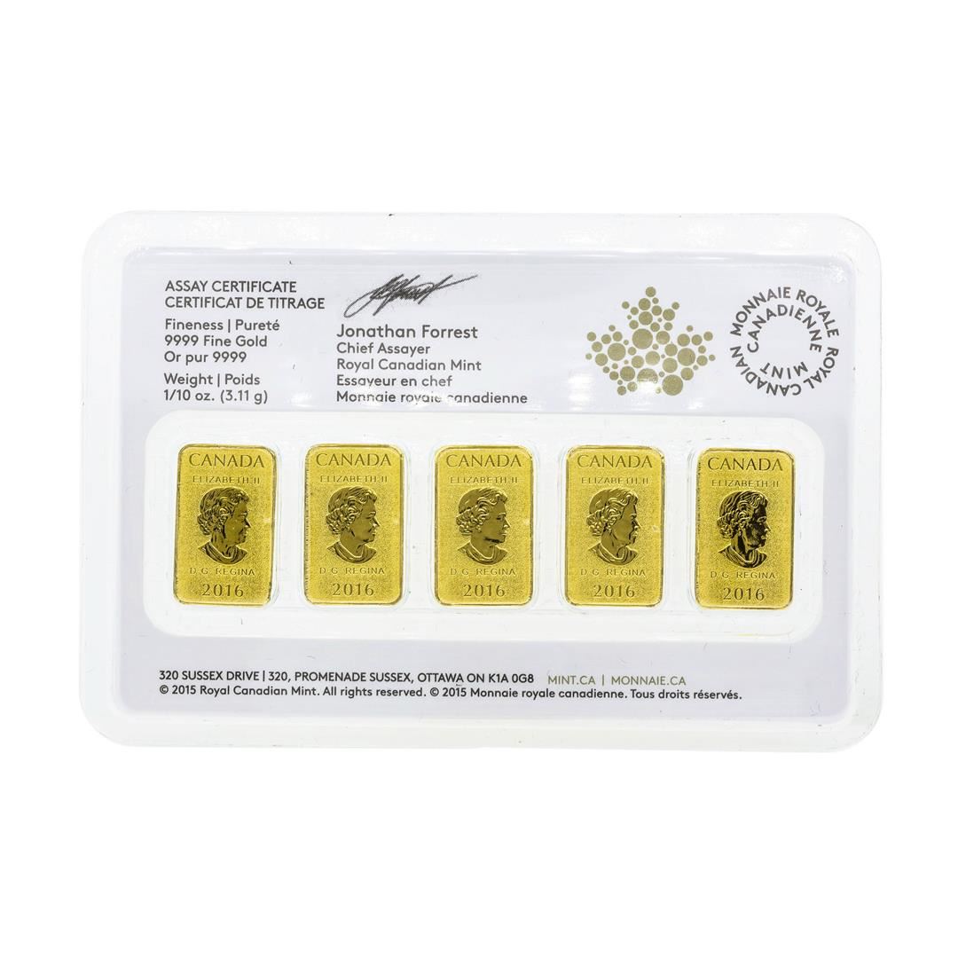 One Lot of (5) 2016 1/10oz Royal Canadian Mint .9999 Fine Gold Ingots.