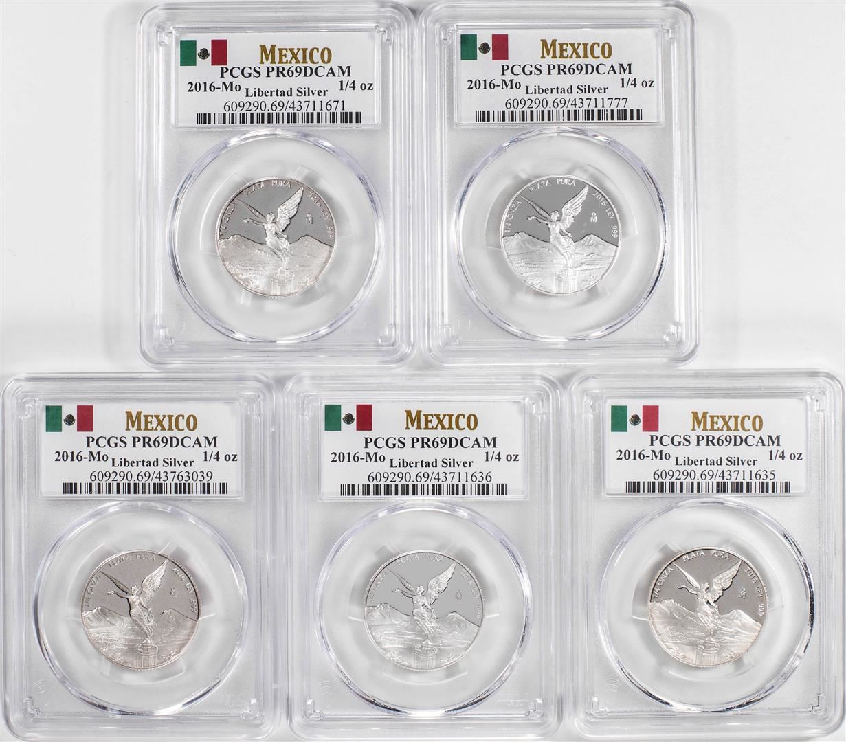 Lot of (5) 2016-Mo Mexico Proof 1/4 oz Silver Libertad Coins PCGS PR69DCAM