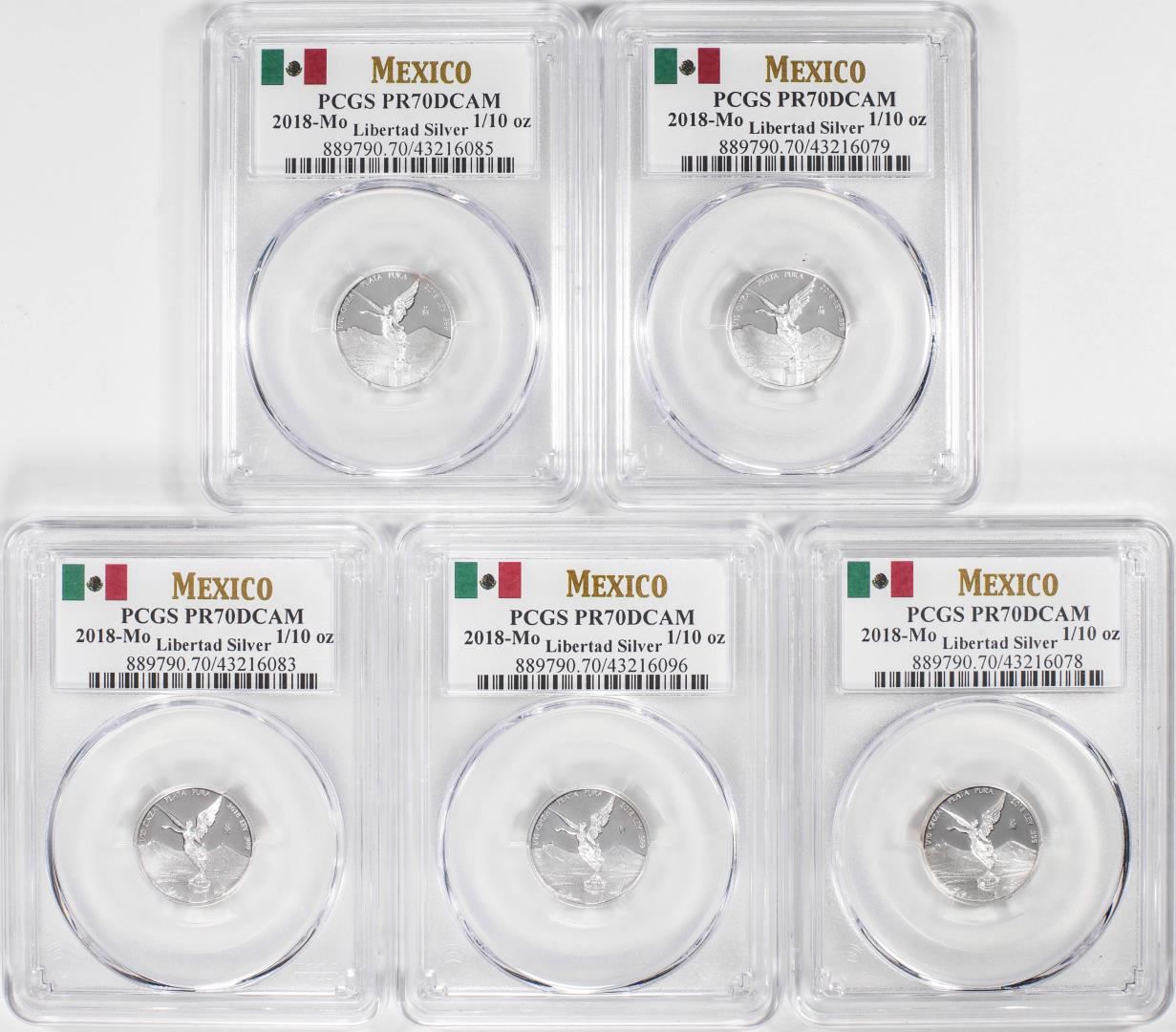 Lot of (5) 2018-Mo Mexico Proof 1/10 oz Silver Libertad Coins PCGS PR70DCAM