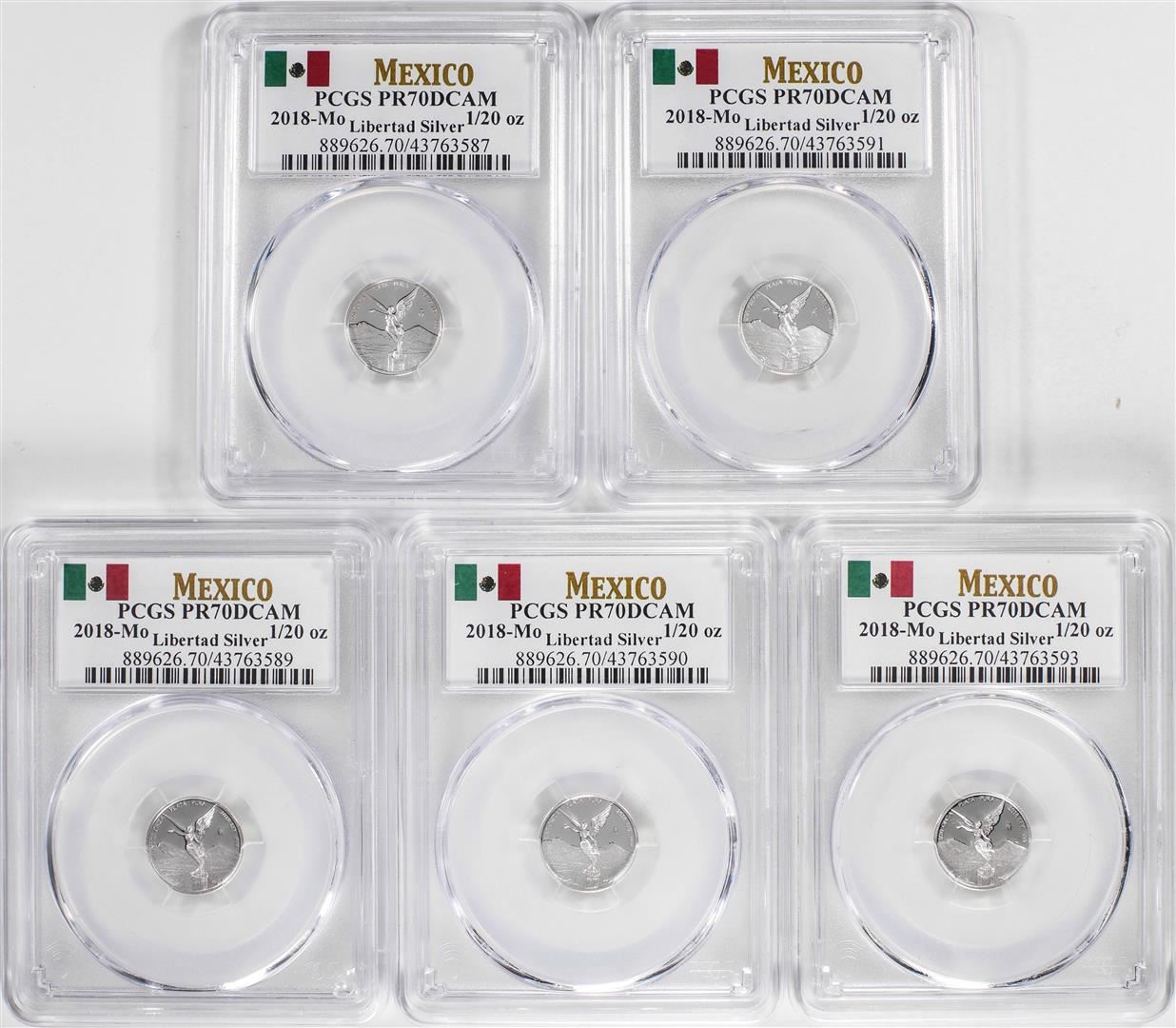 Lot of (5) 2018-Mo Mexico Proof 1/20 oz Silver Libertad Coins PCGS PR70DCAM