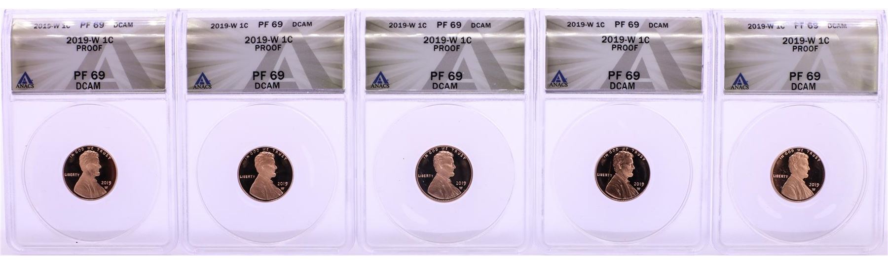 Lot of (5) 2019-W Proof Lincoln Cent Coins ANACS PF69 DCAM