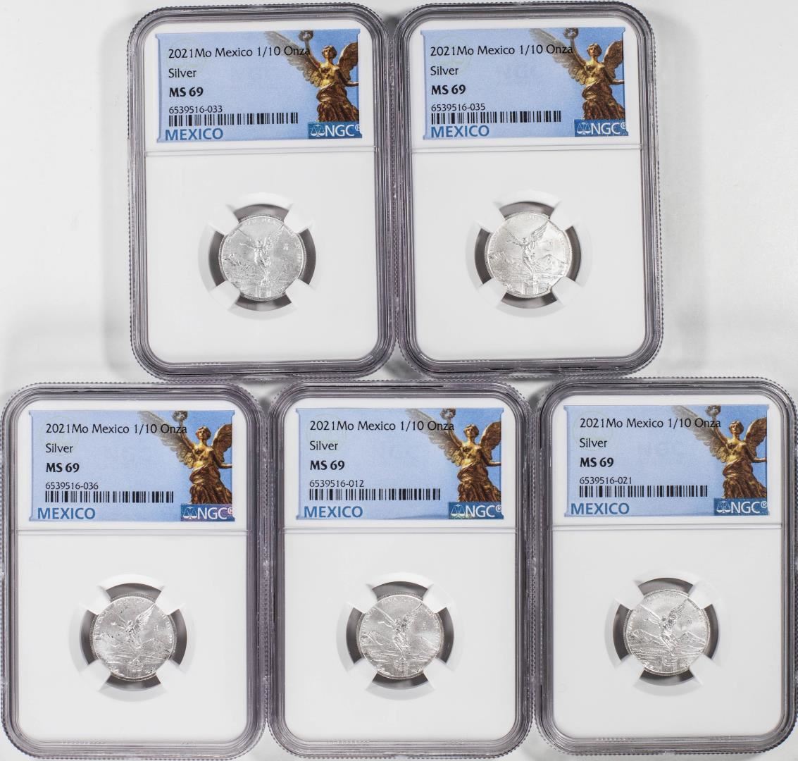 Lot of (5) 2021-Mo Mexico 1/10 oz Silver Libertad Coins NGC MS69